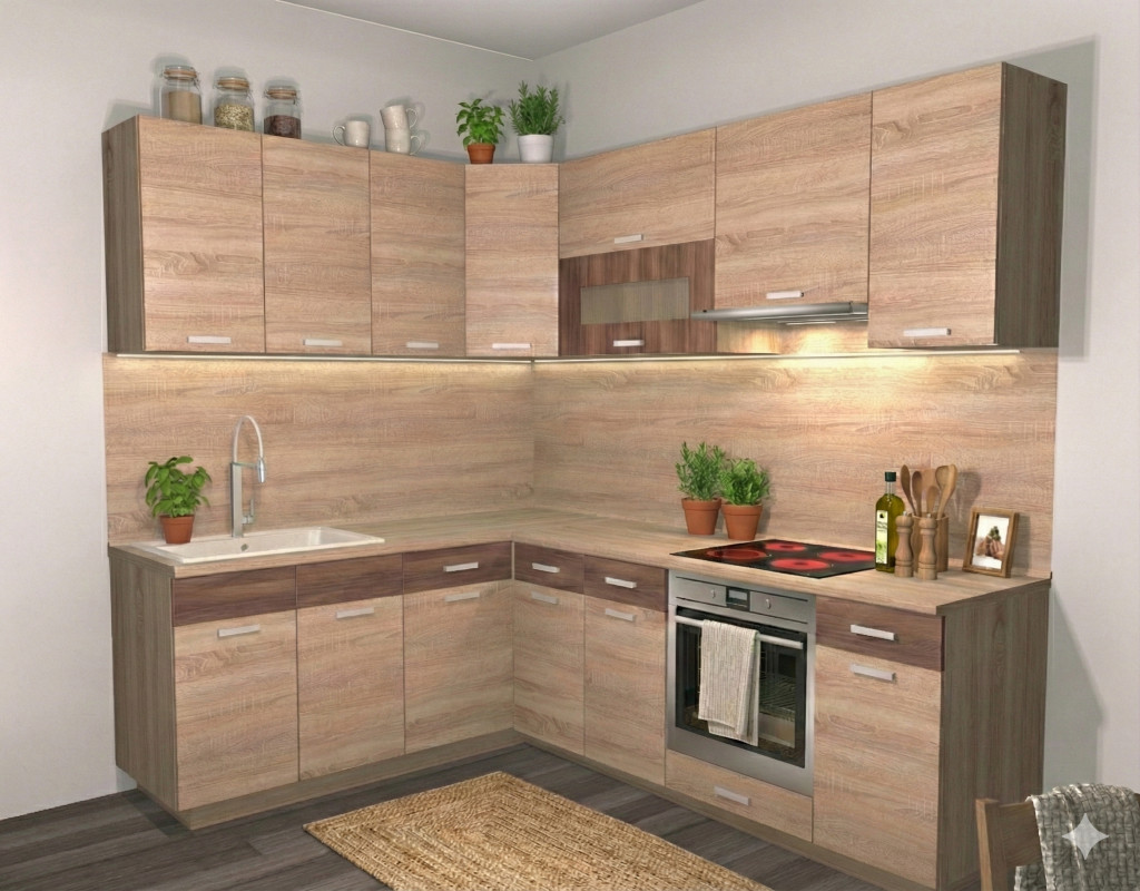 A képen látható Csenge konyha össze állítás 180x240 cm-es . Az ár tartalmazza a választható munkalapot de mosogató tálca és gépeket nem .